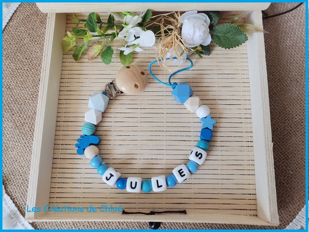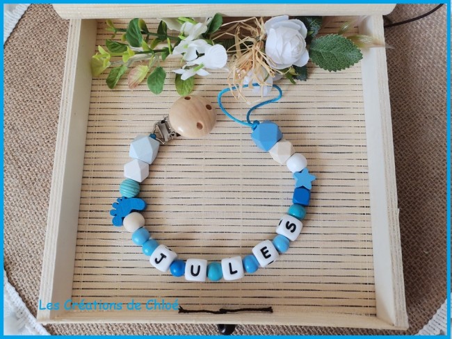 Attache tétine personnalisée perles bois silicone bleu/blanc/bois