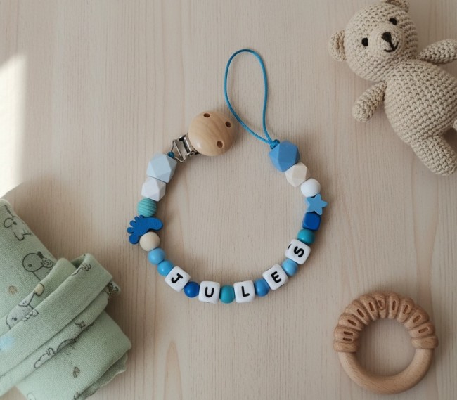Cette attache tétine personnalisée est fabriquée avec des perles en bois de différentes tailles, formes et couleurs, et des perles alphabet en silicone.