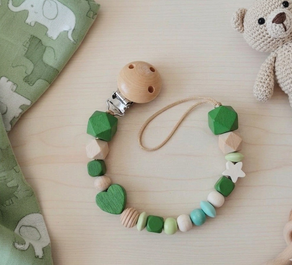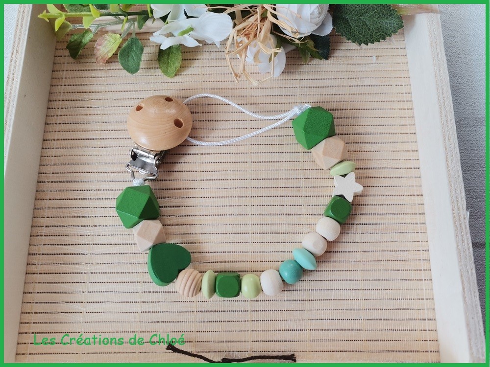 Cette attache tétine personnalisée est fabriquée avec des perles en bois de différentes tailles, formes et couleurs.