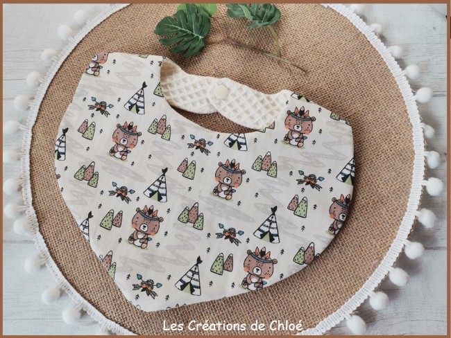 Ce joli petit bavoir se ferme par un bouton pression en résine de couleur beige