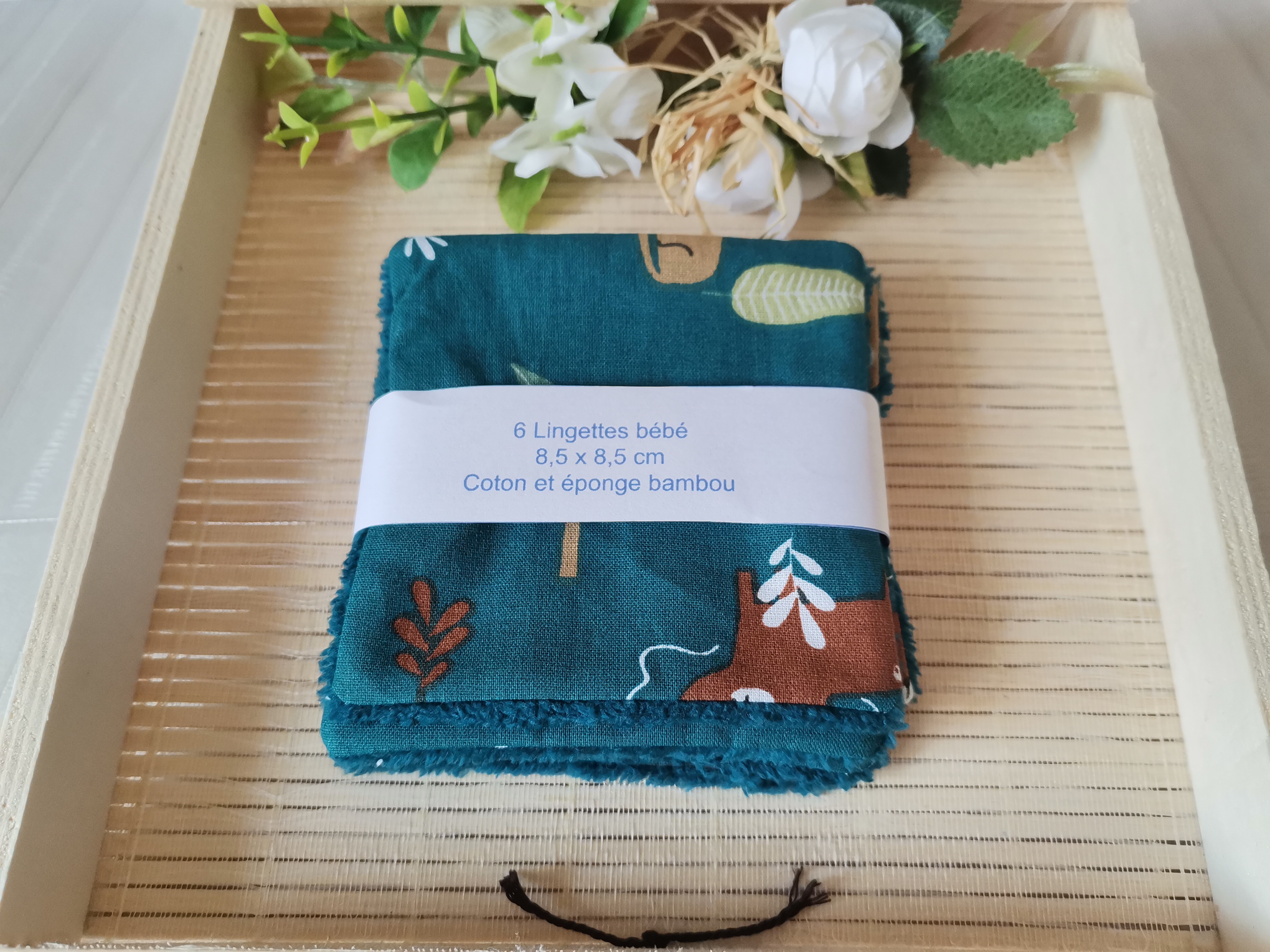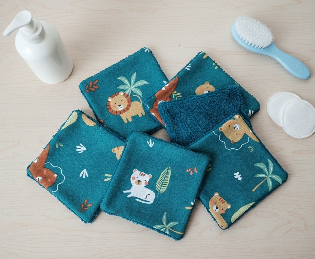 Une face coton certifié Oeko-Tex motifs animaux et l'autre face en éponge bambou de couleur turquoise