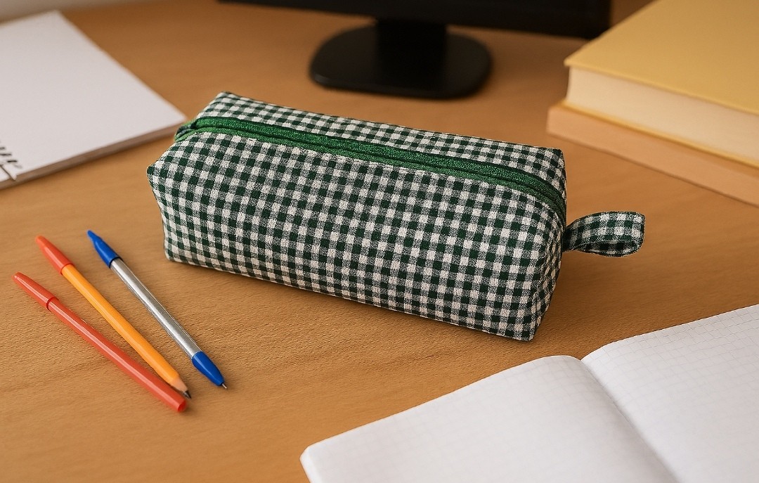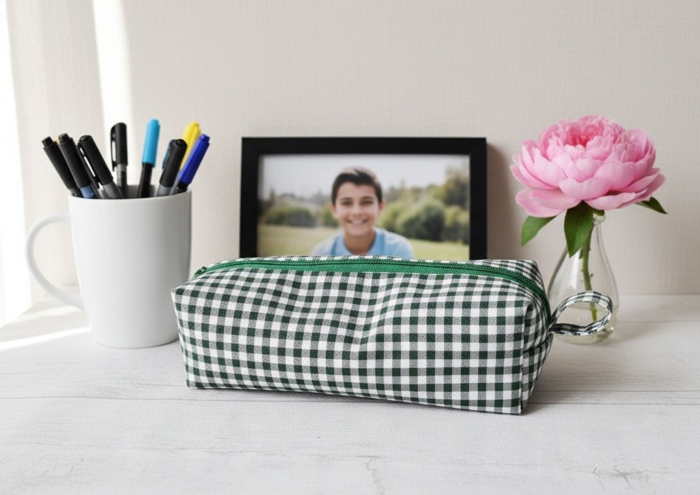 Trousse fourre tout (écolier, maquillage ou autre) en tissus coton certifié Oeko-Tex de couleur vichy vert et doublure tissus coton uni de couleur vert .
