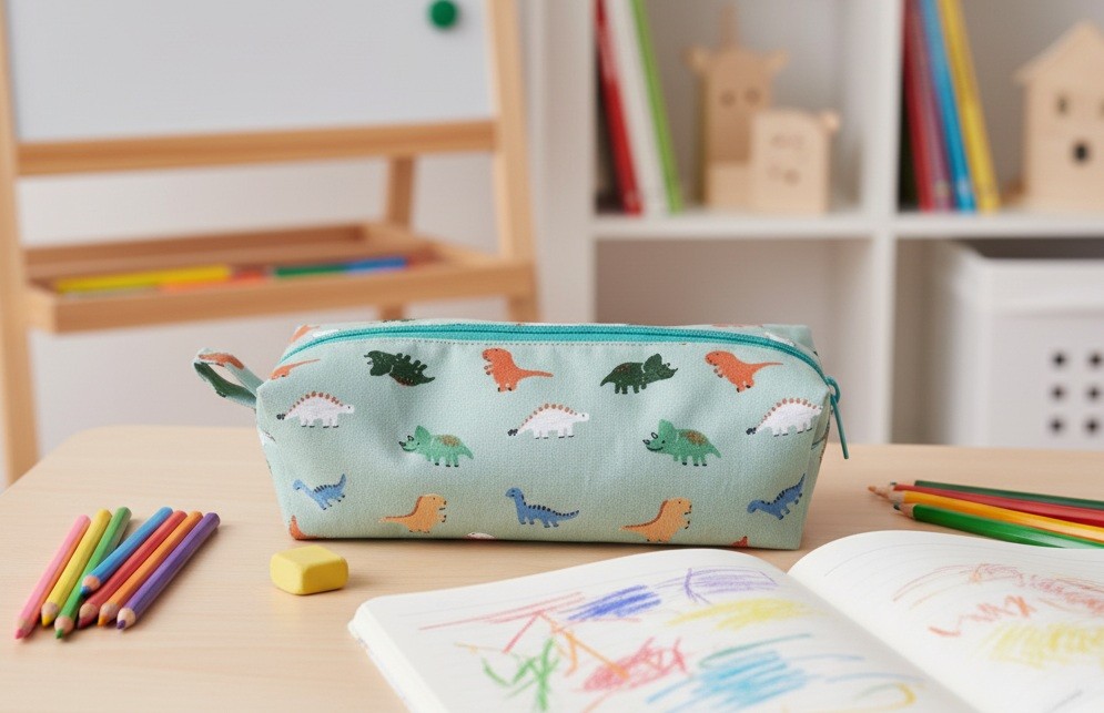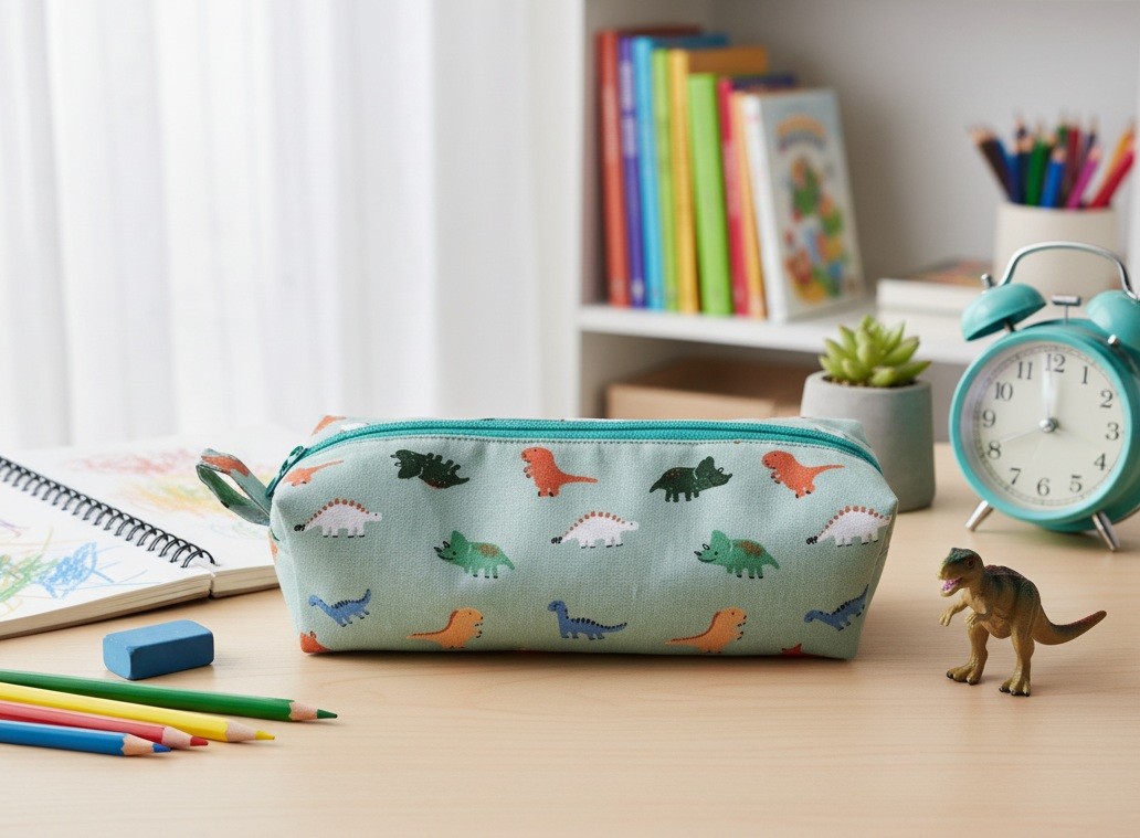 Trousse zippée en coton certifié Oeko-Tex motif dinosaures intérieur doublé d'un tissu coton de couleur vert - Entoilage de renfort pour le tissu principal et tissu doublure - Fermeture zippée de couleur verte