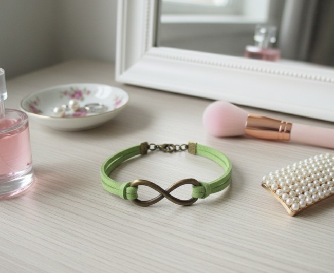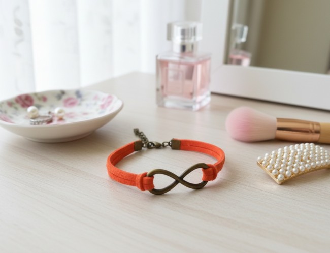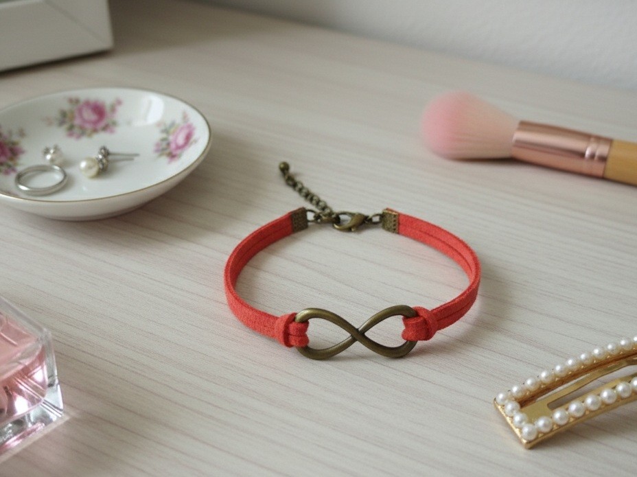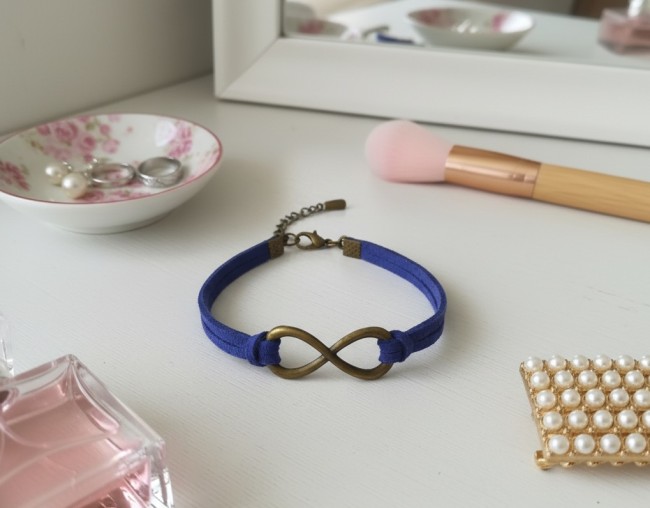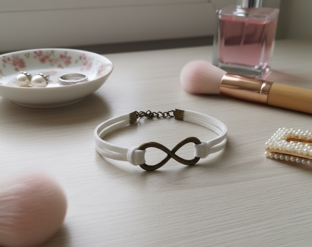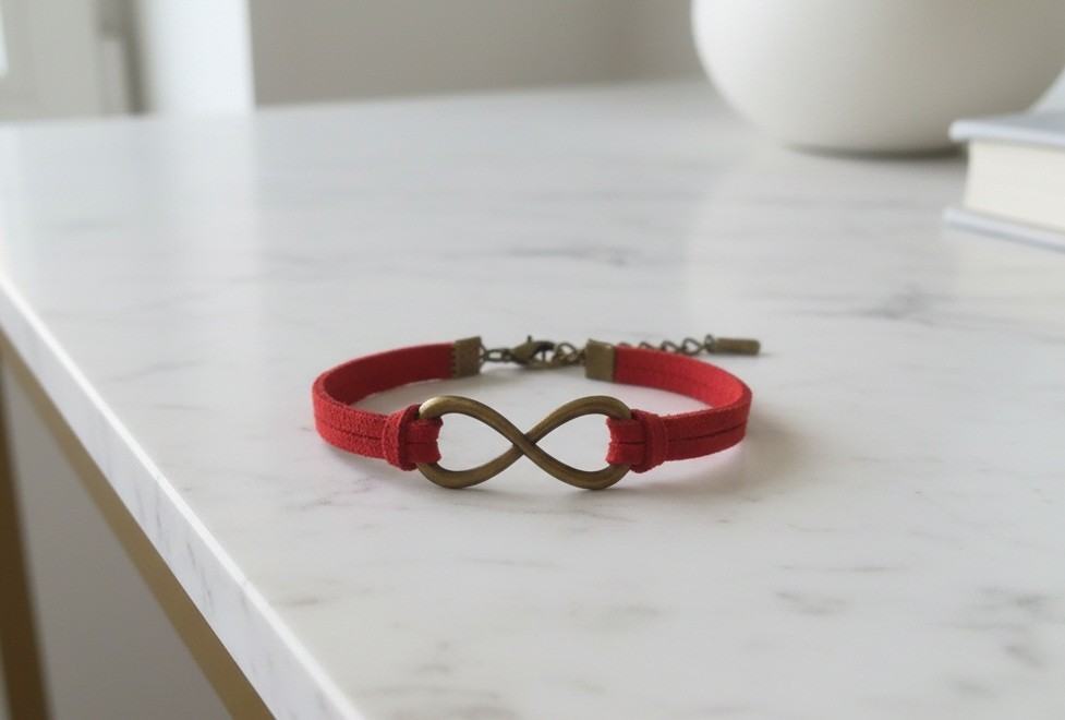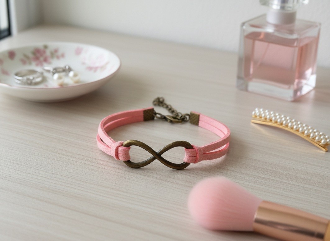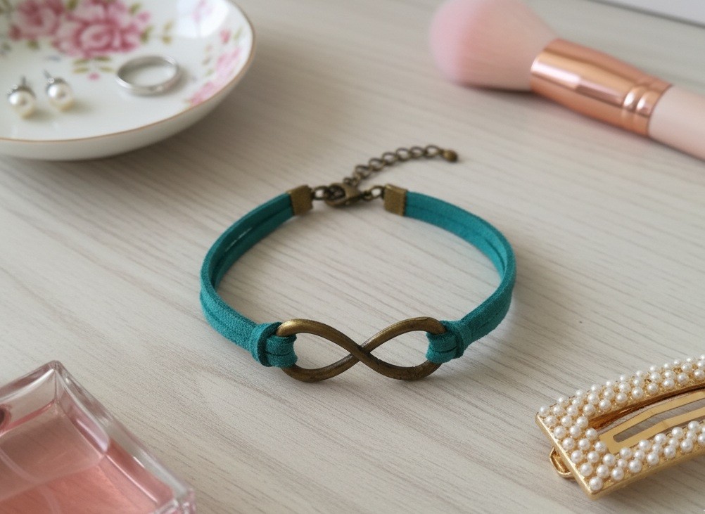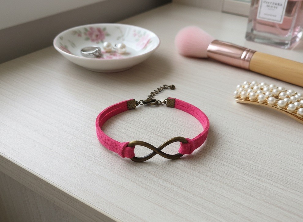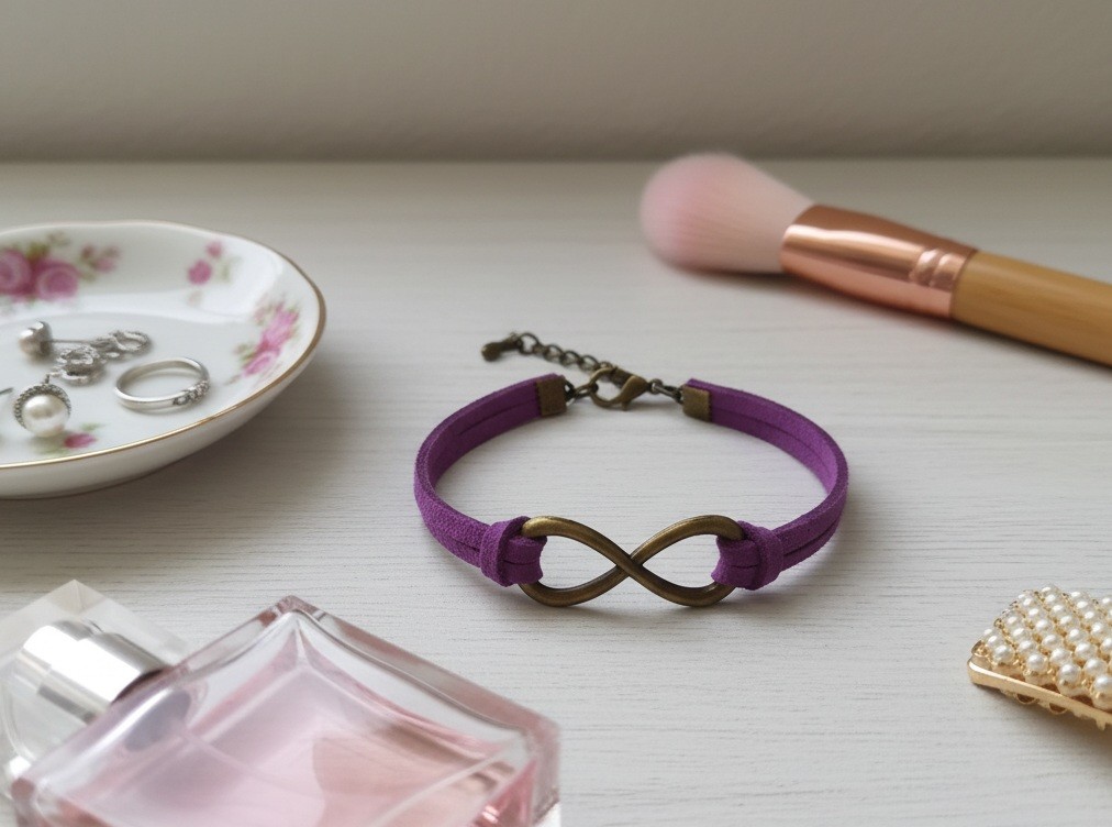 Bracelet suédine avec lien infini métal bronze. Ajustable grâce à une chaînette d'extension de 5 cm et fermeture par fermoir mousqueton