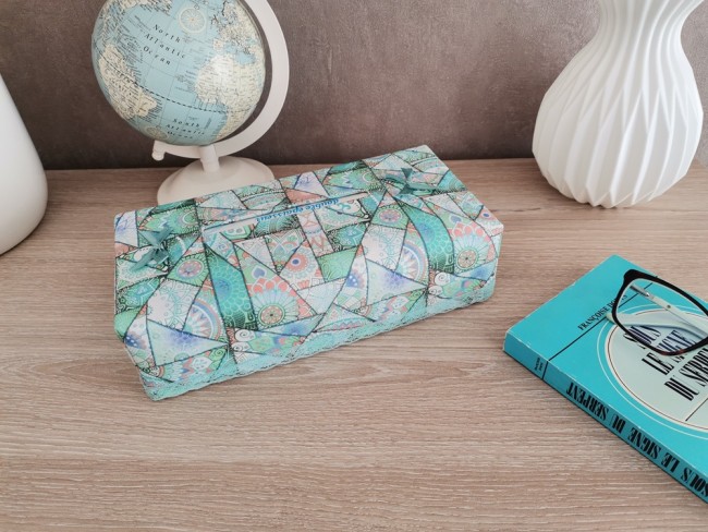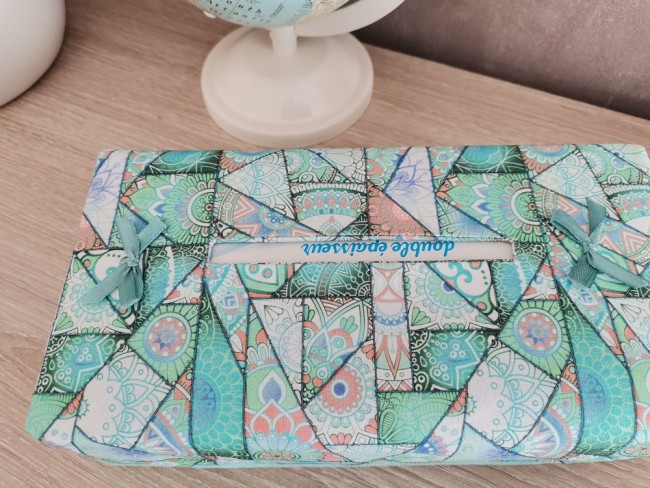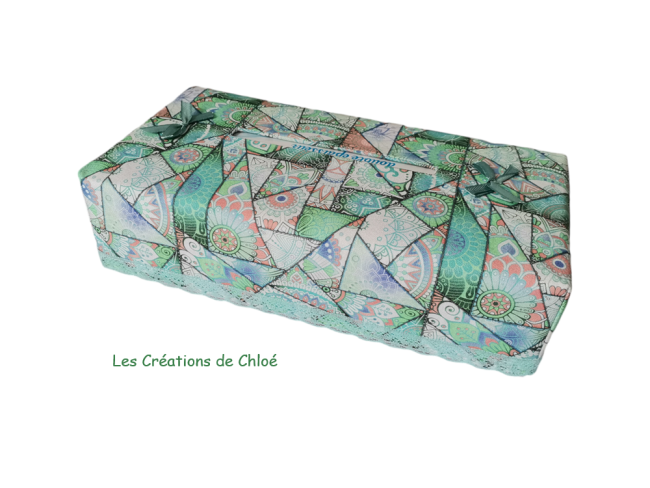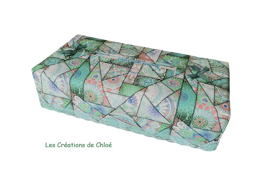 Tissu coton à motifs géométriques, entourage en dentelle de couleur verte et 2 petits noeuds papillon sur le dessus