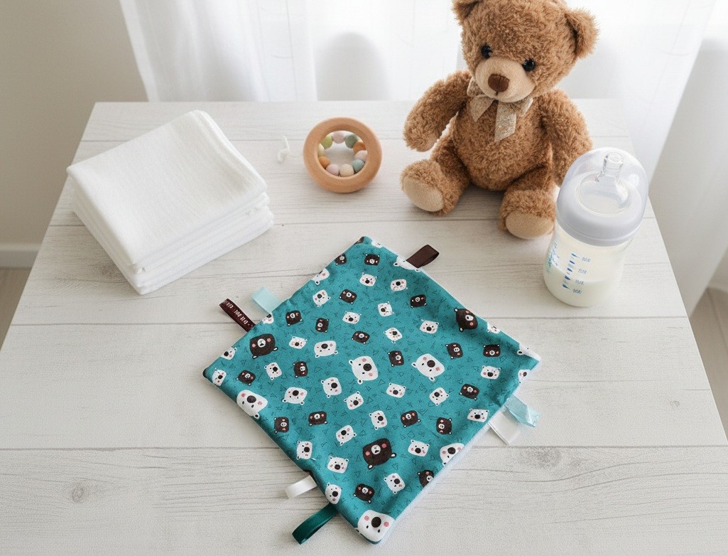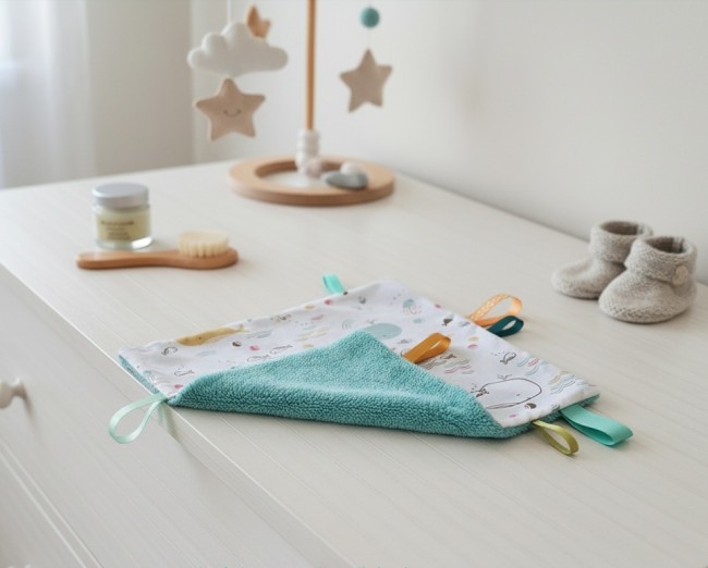 Doudou carré étiquettes parfait pour l'éveil de bébé .