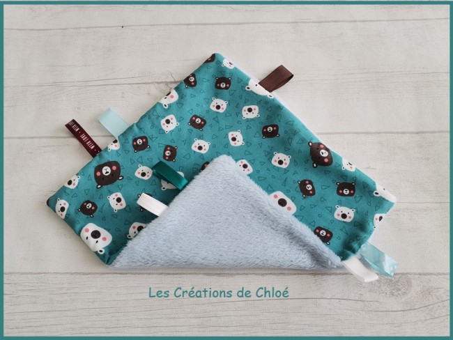 Un coté tout doux en tissu doudou de couleur bleu,l'autre face en coton certifié Oeko-Tex imprimé et