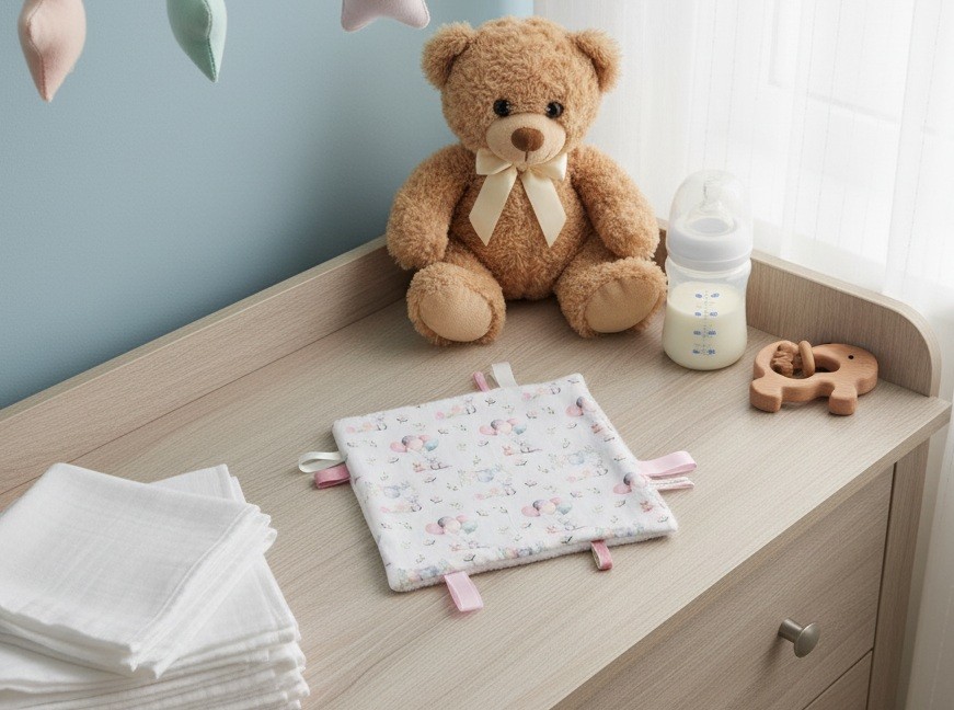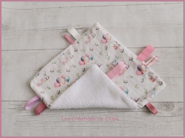 Doudou carré étiquettes parfait pour l'éveil de bébé .