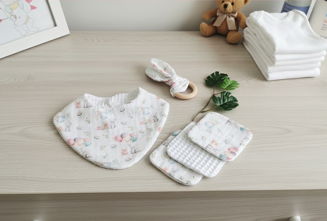 Ensemble naissance idéal pour les premiers repas de bébé avec un bavoir, hochet et 8 lingettes assorties