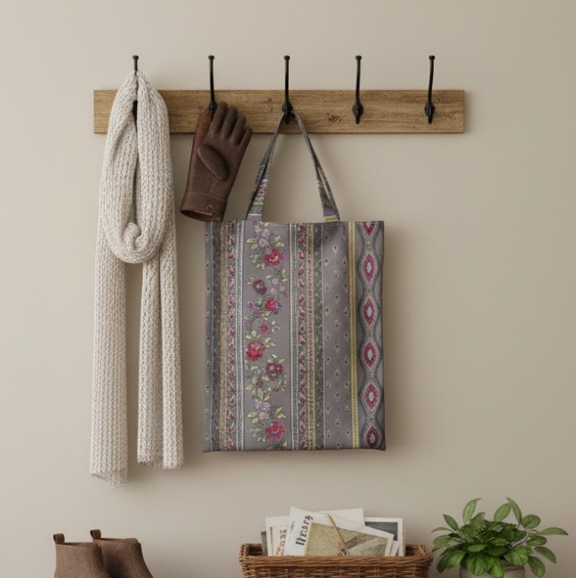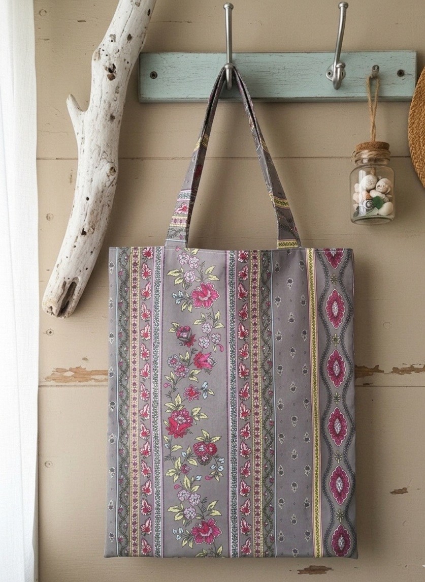 Confectionné dans un tissu coton certifié Oeko-Tex de couleur gris et motifs fleurs, doublé d'un tissu coton peigné rose avec une poche intérieure 2 compartiments (un pour le portable et l'autre pour le porte feuille par exemple)