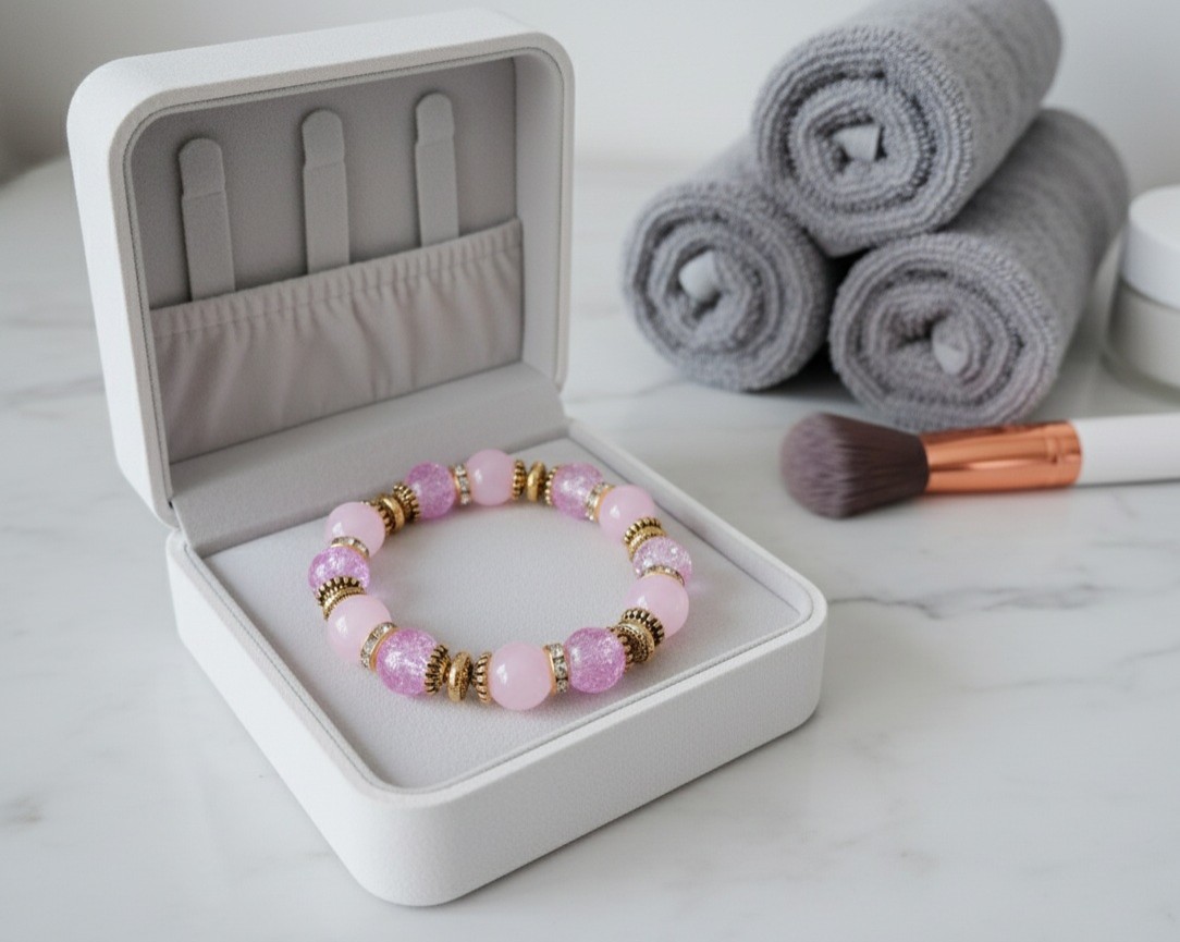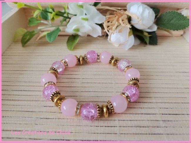 Bracelet sur fil élastique avec perles en verre imitation jade de couleur rose, perles en verre craquelé transparente et apprêts de couleur doré