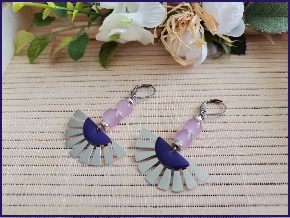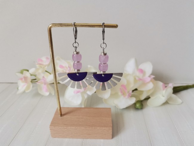Boucles d'oreilles acier inoxydable (dormeuse, tige et anneaux) avec pendentif forme éventail de dimension 3.5 x 1.8 cm, perles colonnes mauve 8 mm et pendentif émail demi rond violet