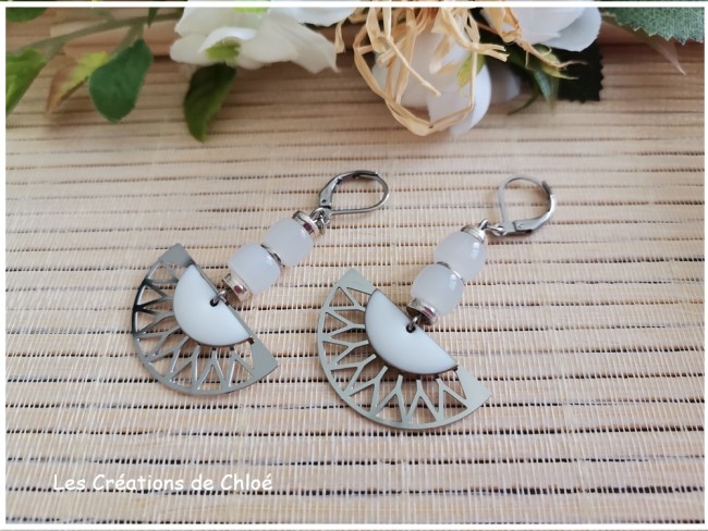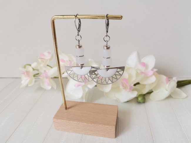 Boucles d'oreilles acier inoxydable (Pendentif éventail, dormeuse, tige et anneaux) avec pendentif forme éventail de dimension 3 x 1.8 cm, perles colonnes blanche transparente 8 mm et pendentif émail demi rond blanc