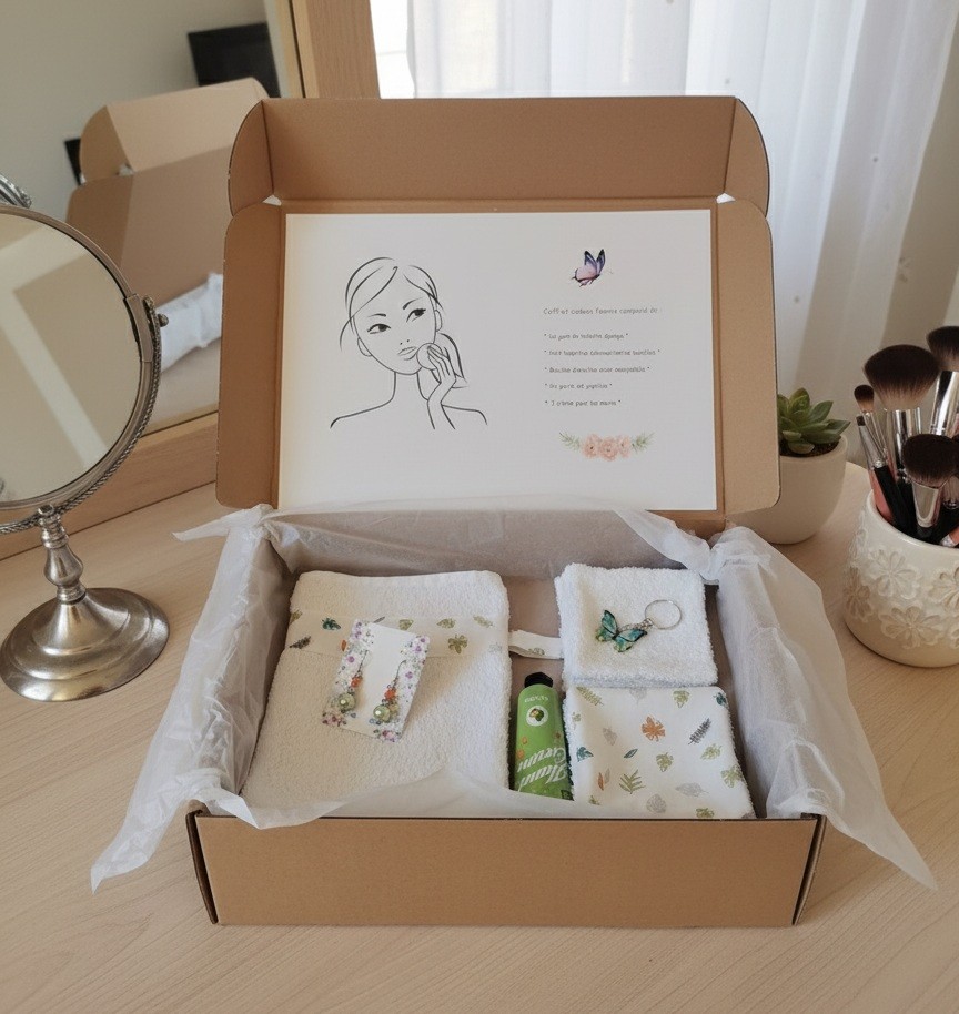 Cette box est composée d'un gant éponge, 8 lingettes démaquillantes en coton certifié Oeko-Tex et éponge, une crème hydratante pour les mains, un porte clé papillon et d'une paire de boucles d'oreilles aux couleurs assorties. Vendu avec sa boite en carton et emballé dans une feuille de papier de soie. Idéal cadeaux fête des mères et anniversaire.