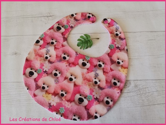 Ce joli petit bavoir se ferme par un bouton pression en résine de couleur rose