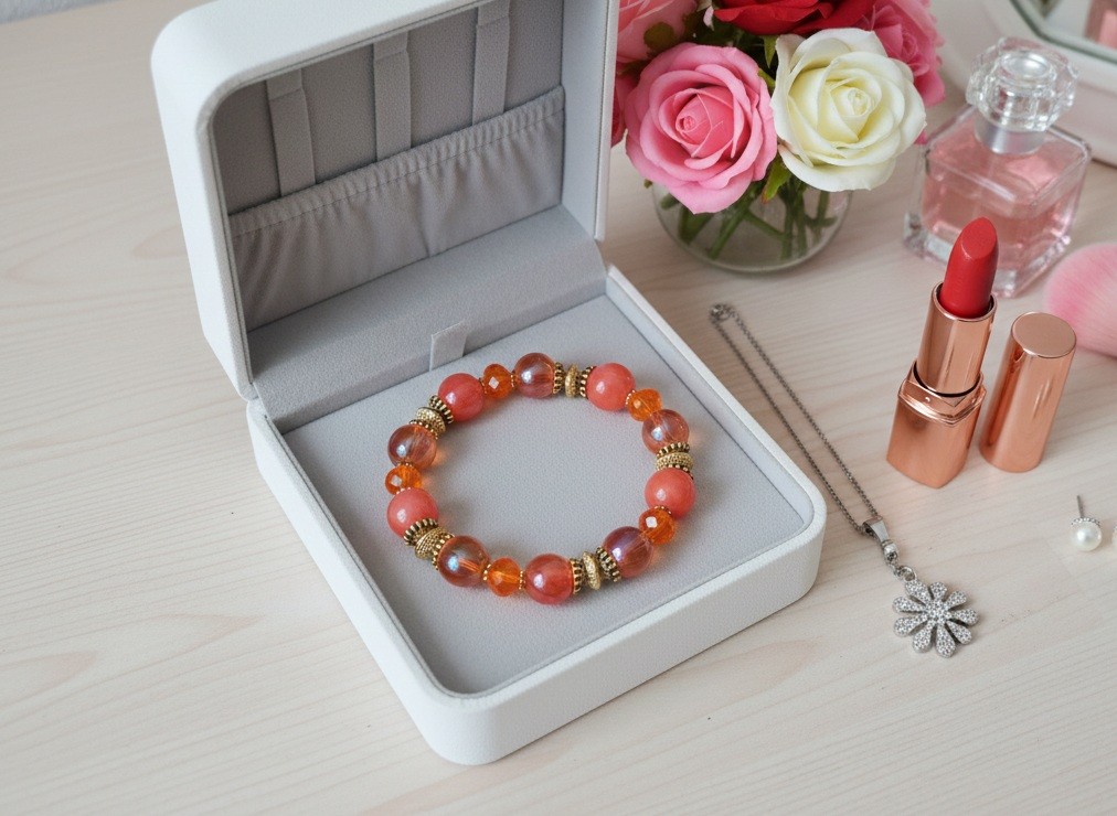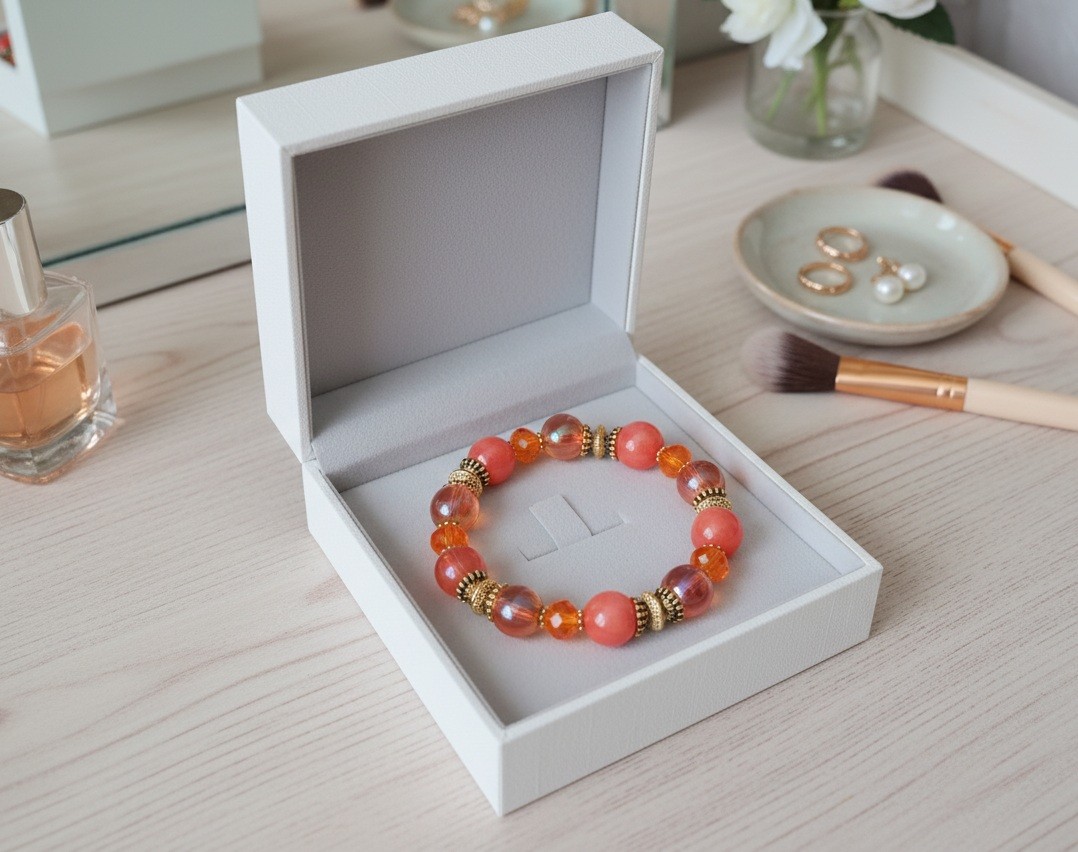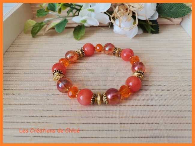 Bracelet sur fil élastique avec perles jade de couleur orange, perles en verre laqué de 10 mm, perles en verre à facettes 8 x 6 mm de couleur orange et apprêts de couleur dorée