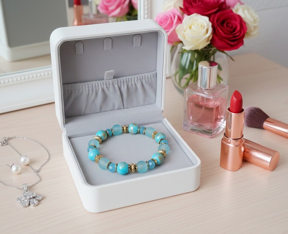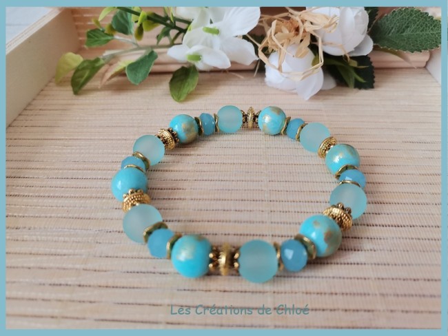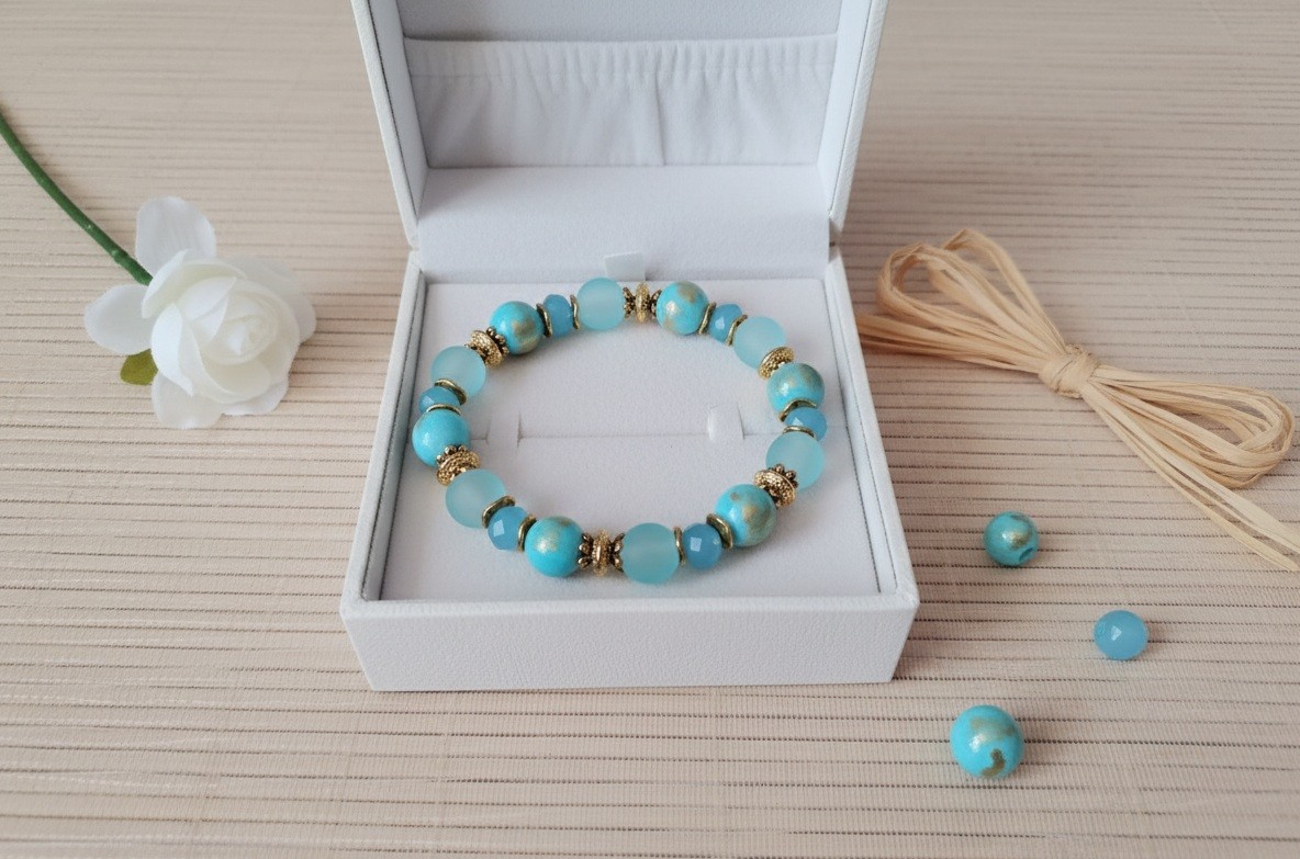 Bracelet sur fil élastique avec perles jade de couleur bleue taches dorées, perles en verre givré couleur bleu ciel de 10 mm, perles en verre à facettes 8 x 6 mm de couleur bleu pale opaque et apprêts de couleur dorée