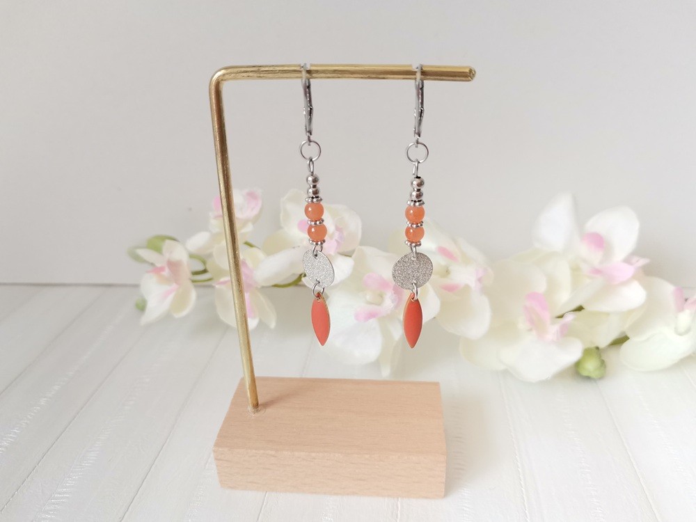 Boucles d'oreilles acier inoxydable et pendentif émail goutte orange