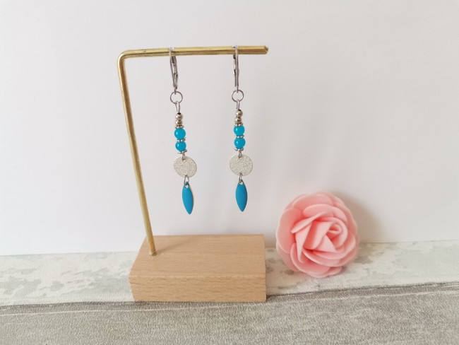 Boucles d'oreilles acier inoxydable et pendentif émail goutte bleue