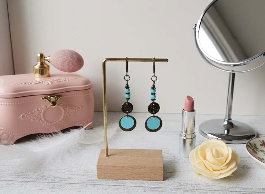 Boucles d'oreilles pendantes avec dormeuses à levier, petites perles en verre de 4 mm, connecteur métal rond bronze, pendentif métal rond bronze et sequin bleu