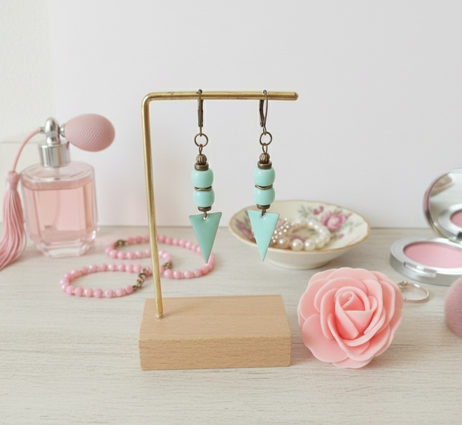 Boucles d'oreilles pendantes avec pendentif triangle en émail, perles en verre colonne et apprêts de couleur bronze