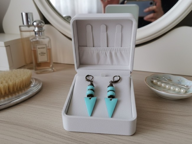 Boucles d'oreilles pendentif émail et perles colonnes bleu vert