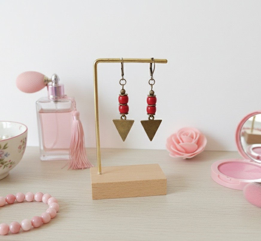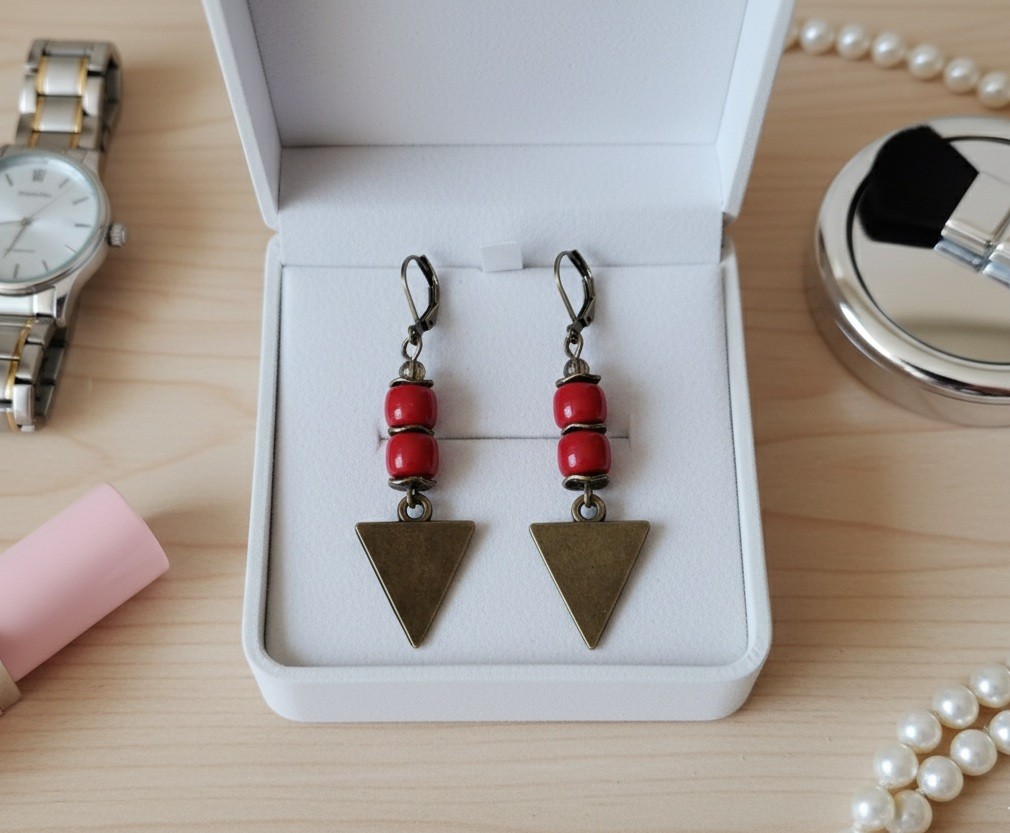 Boucles d'oreilles pendentif bronze et perles colonne rouge