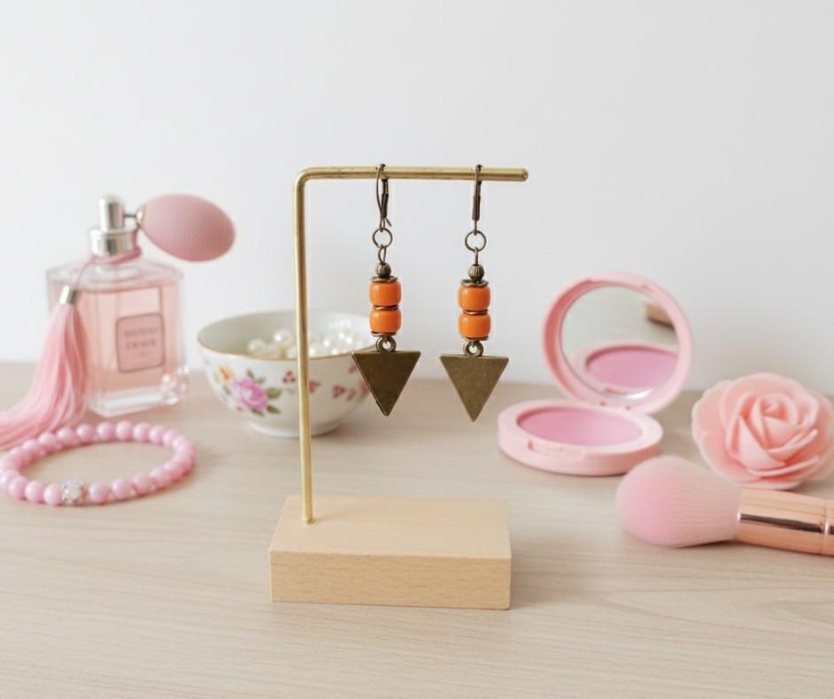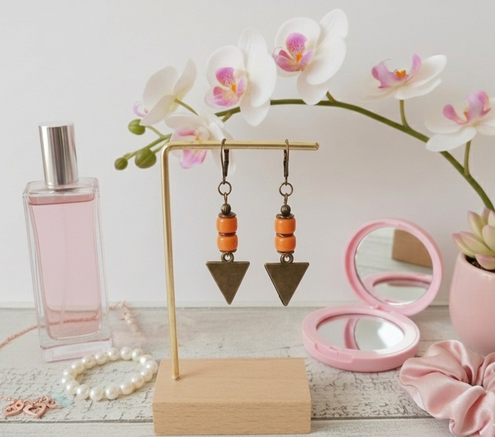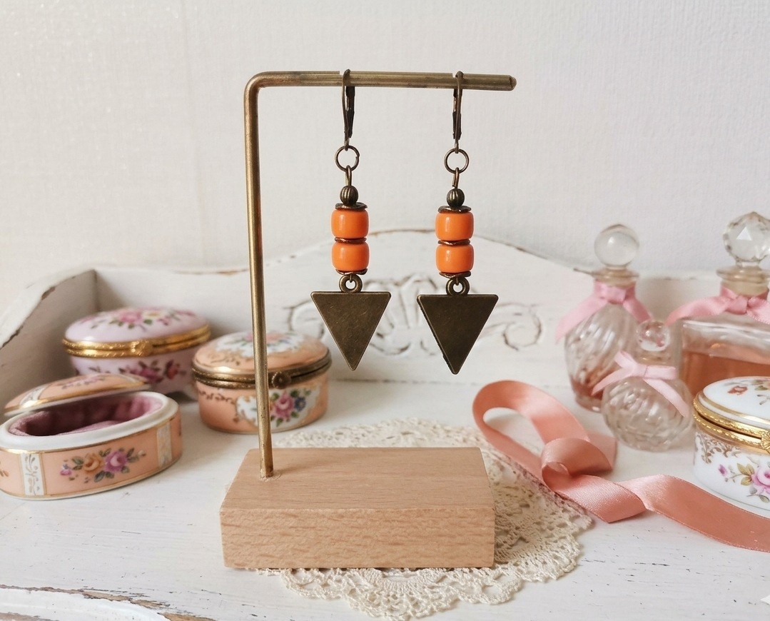 Boucles d'oreilles pendantes avec pendentif triangle en métal, perles en verre colonne et apprêts de couleur bronze