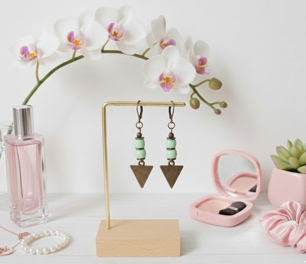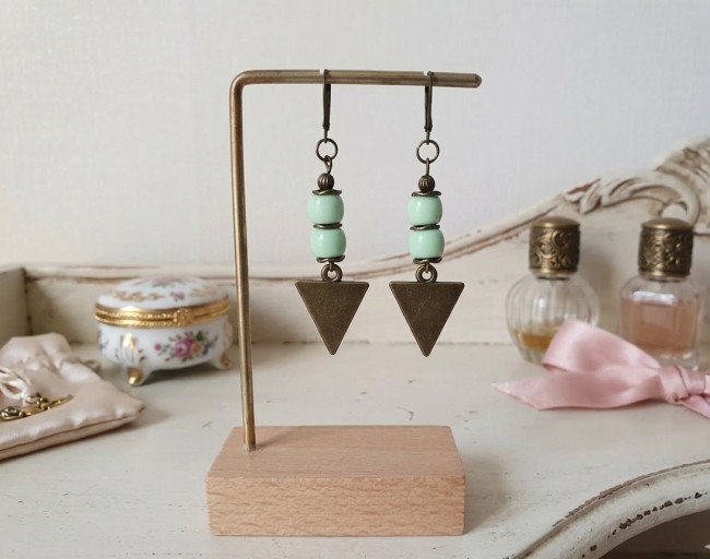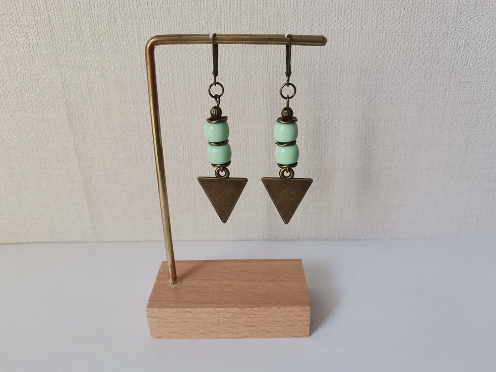 Boucles d'oreilles pendantes avec pendentif triangle en métal, perles en verre colonne et apprêts de couleur bronze