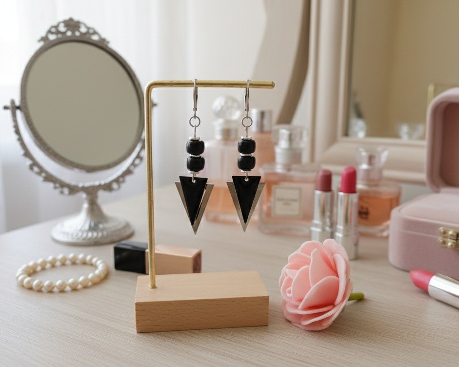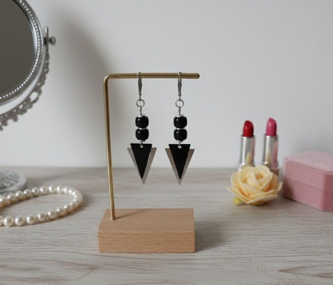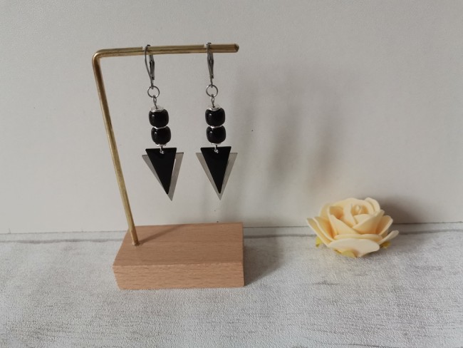 Boucles d'oreilles montées sur dormeuses à levier, avec perles en verre colonne et pendentifs triangle métal et émail