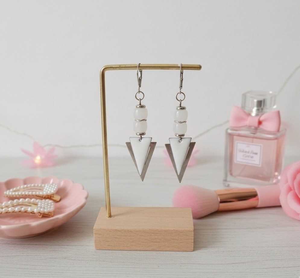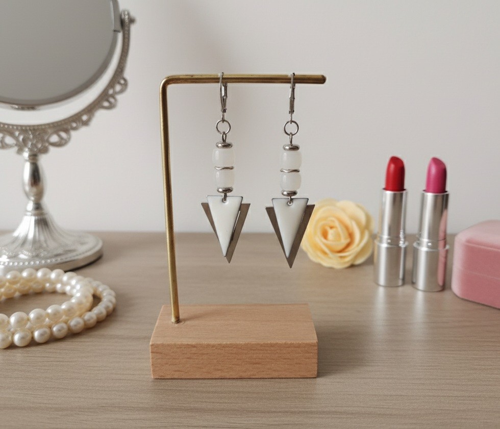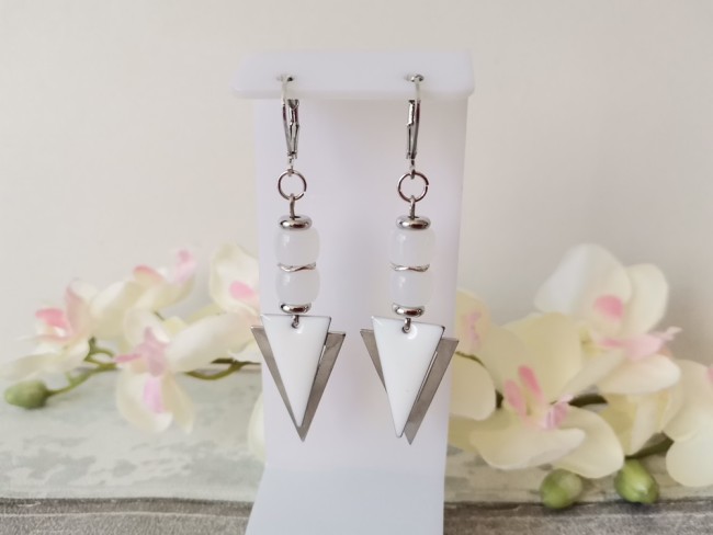 Boucles d'oreilles montées sur dormeuses à levier, avec perles en verre colonne et pendentifs triangle métal et émail