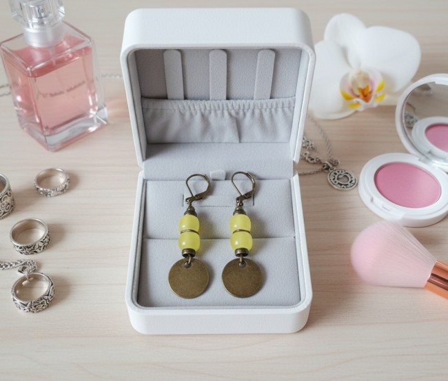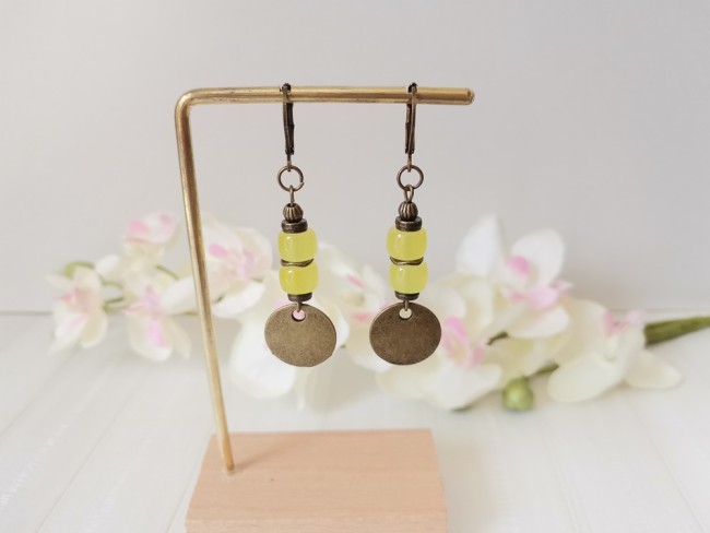 Kit boucles d'oreilles pendentif rond et perles colonnes jaune