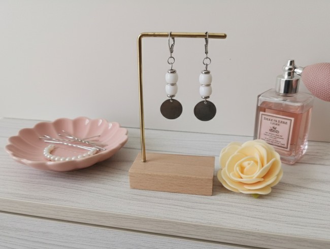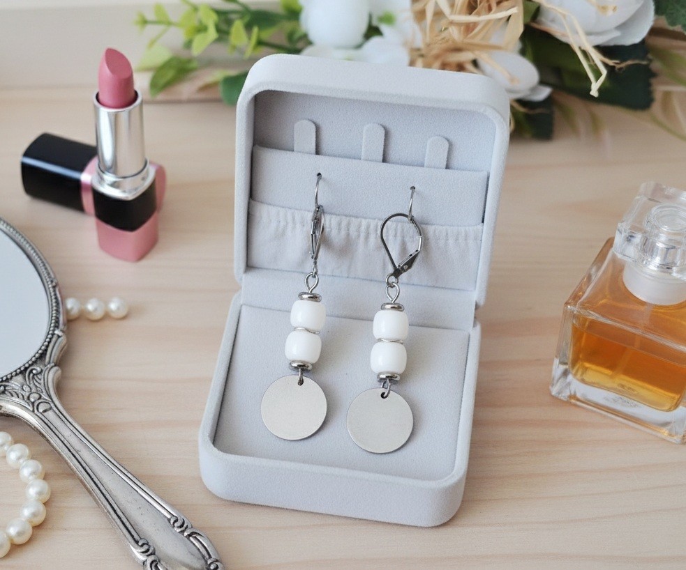 Boucles d'oreilles acier inoxydable, sequin métal et perles colonnes blanches