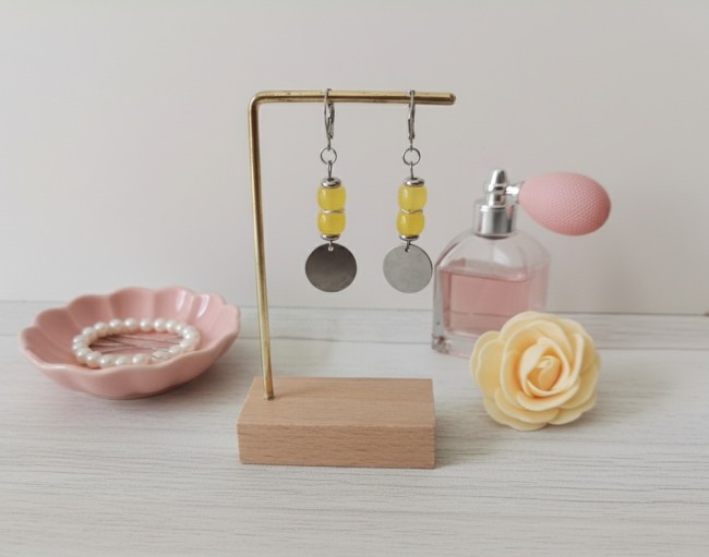 Boucles d'oreilles acier inoxydable, sequin métal et perles colonnes jaune clair