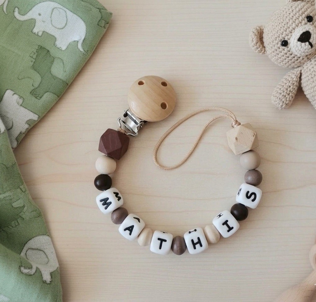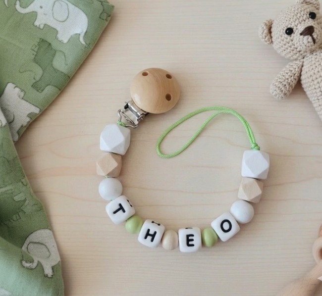 Cette attache tétine personnalisée est fabriquée avec des perles en bois de différentes tailles, formes et couleurs, et des perles alphabet en silicone.