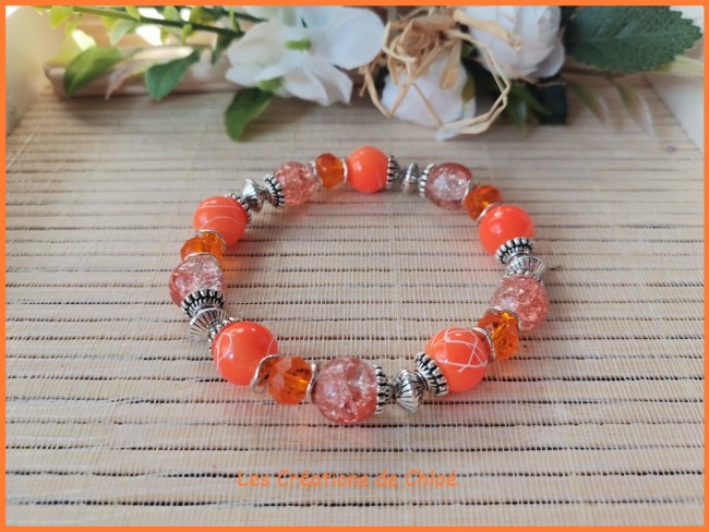 Bracelet sur fil élastique avec perles en verre tréfilé de couleur orange, perles en verre craquelé et apprêts de couleur argent mat
