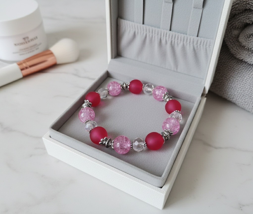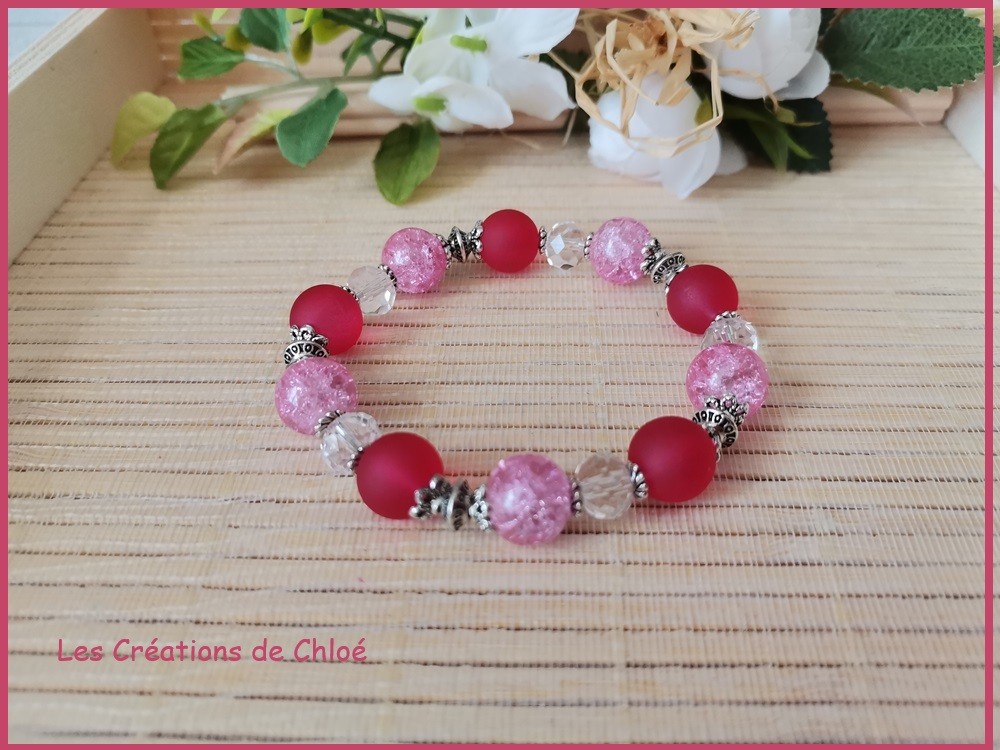 Bracelet sur fil élastique avec perles en verre givré de couleur prune, perles en verre craquelé et apprêts de couleur argent mat