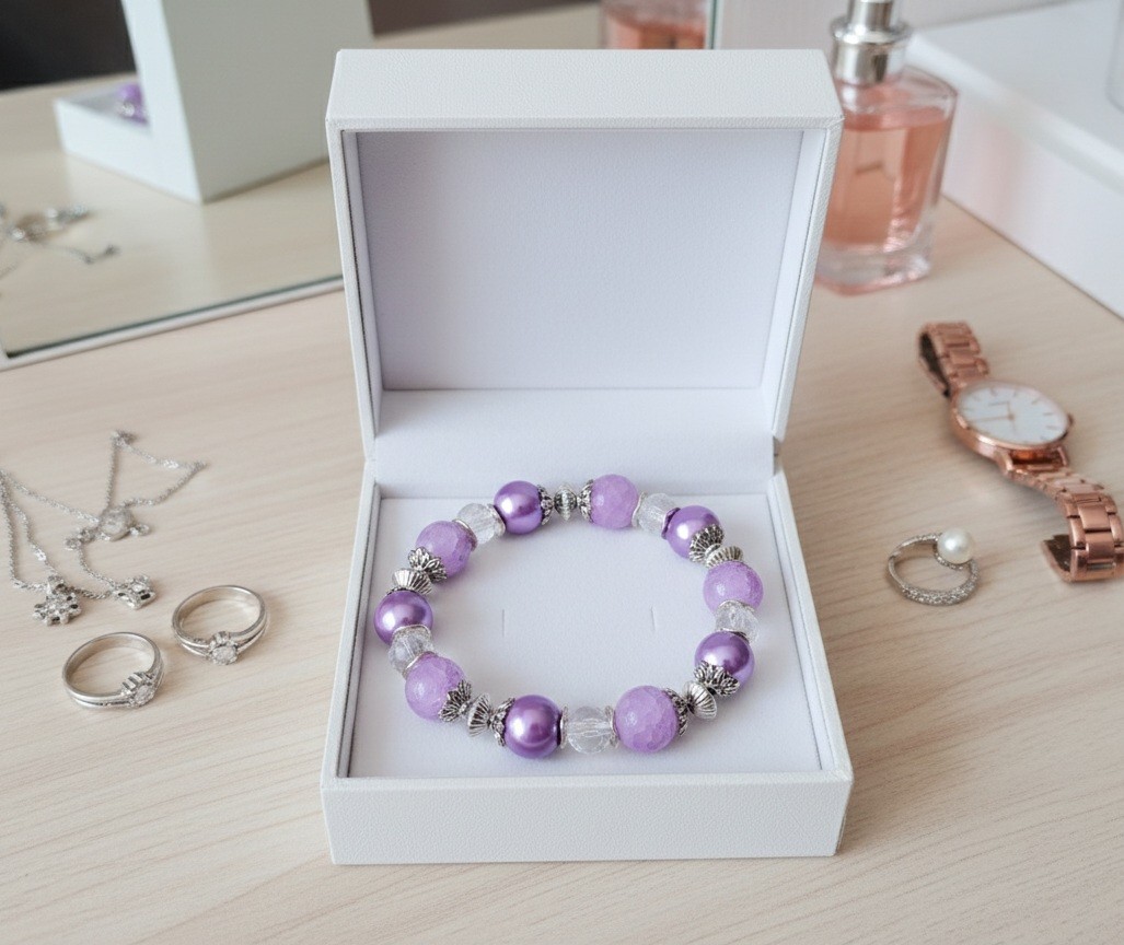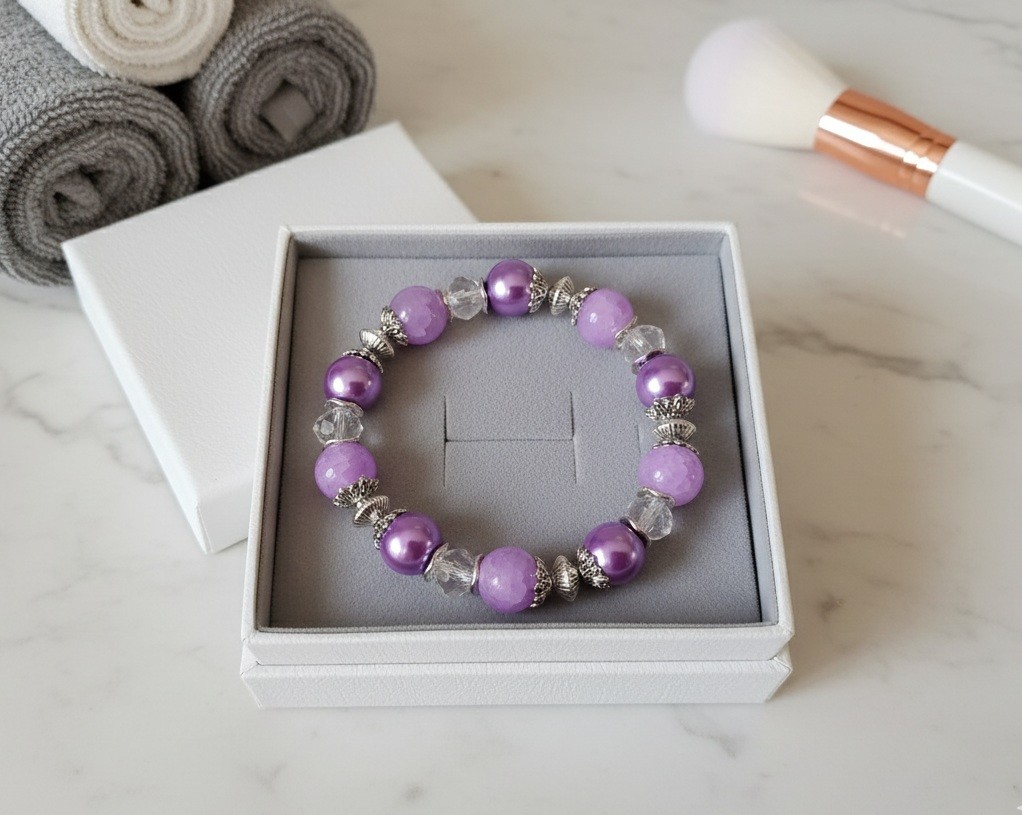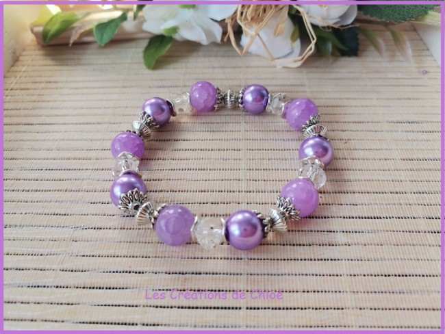 Bracelet sur fil élastique avec perles en verre nacré de couleur mauve, perles en verre craquelé lilas et apprêts de couleur argent mat