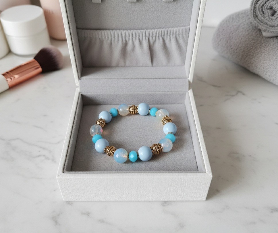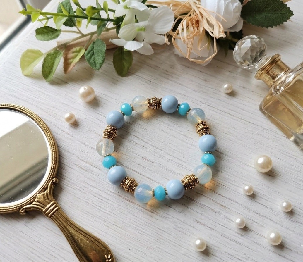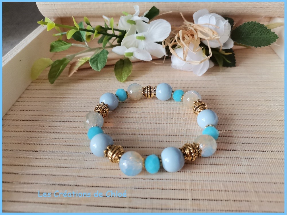 Bracelet sur fil élastique avec perles en verre de couleur bleue, perles en verre craquelé et apprêts de couleur dorée