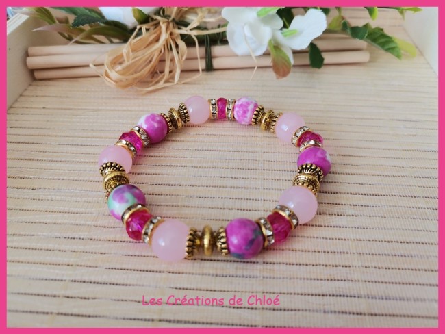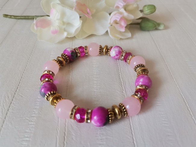 Bracelet sur fil élastique avec perles en verre jade violettes taches multicolores et verre imitation jade de 10 mm de couleur rose pale, perles rondelles strass doré et apprêts de couleur doré