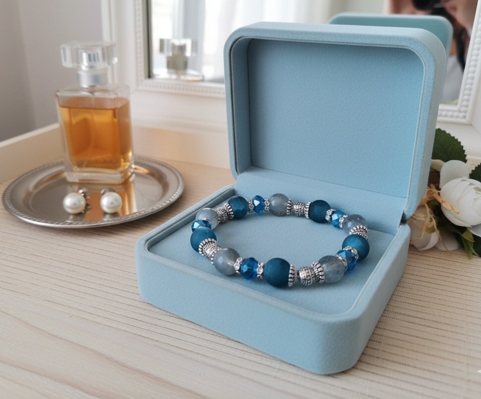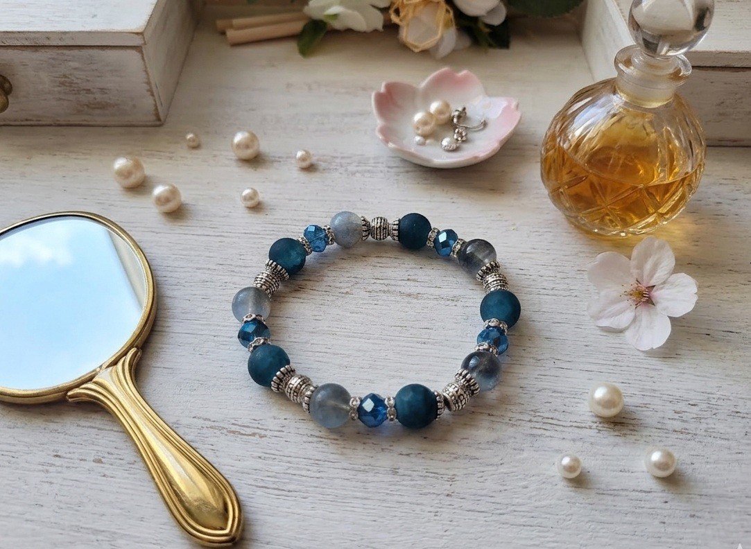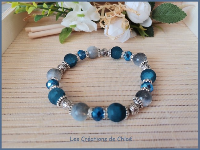 Bracelet sur fil élastique avec perles en verre givré de couleur bleu jean et verre craquelé de 10 mm et apprêts de couleur argent mat