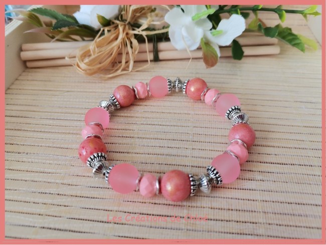 Bracelet sur fil élastique avec perles en verre givré de couleur saumon et perles jade orangé de 10 mm et apprêts de couleur argent mat