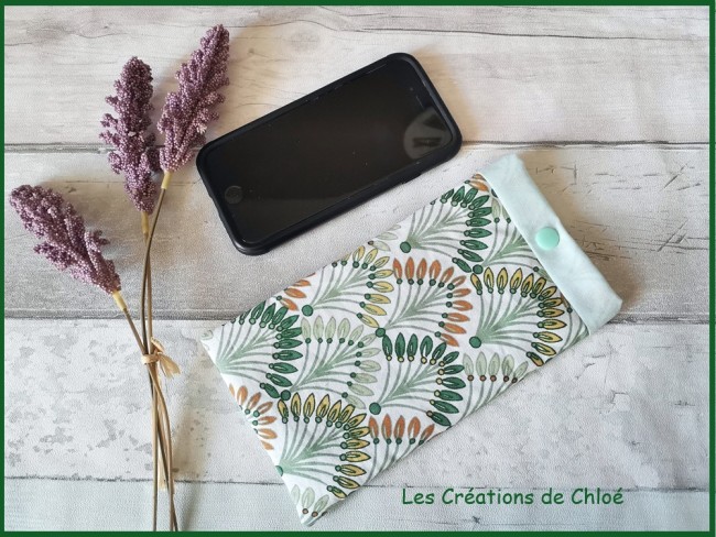 Elle est composée d'un tissu extérieur en coton certifié Oeko-Tex imprimé, un tissu intérieur en coton uni et doublée d'une fine ouate pour une meilleure protection de votre téléphone. Fermeture par bouton pression plastique (le bouton n'est pas en contact avec le téléphone).