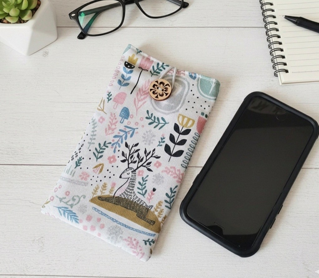 Elle est composée d'un tissu extérieur en coton épais imprimé, un tissu intérieur en coton uni et doublée d'une fine ouate pour une meilleure protection de votre téléphone. Fermeture par bouton avec élastique