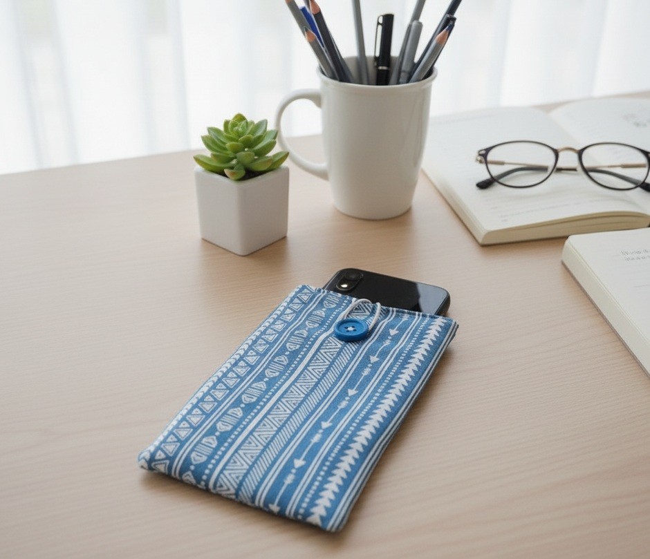 Elle est composée d'un tissu extérieur en coton épais imprimé, un tissu intérieur en coton uni et doublée d'une fine ouate pour une meilleure protection de votre téléphone. Fermeture par bouton avec élastique