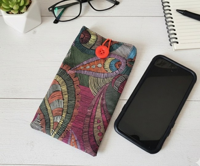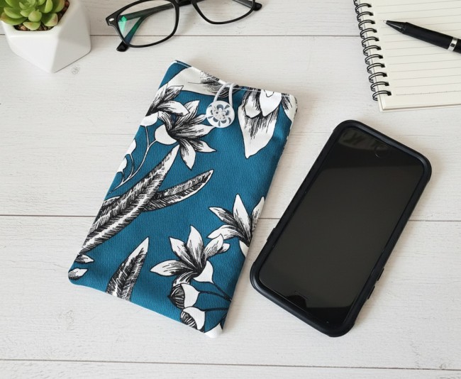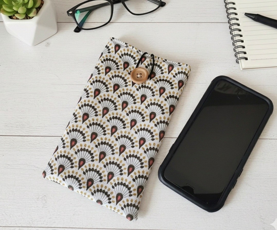 Elle est composée d'un tissu extérieur en coton épais imprimé, un tissu intérieur en coton uni et doublée d'une fine ouate pour une meilleure protection de votre téléphone. Fermeture par bouton avec élastique