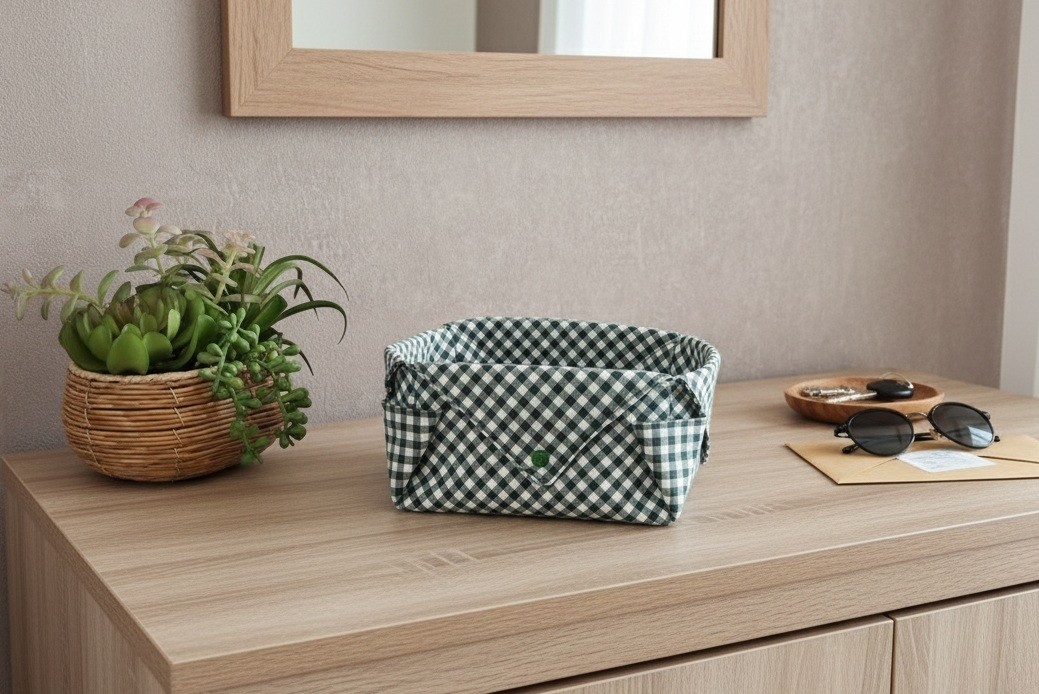 Réalisé en coton imprimé vichy noir et blanc pour les deux faces, intérieure et extérieure avec un renfort en thermocollant pour apporter plus de rigidité et de tenue.