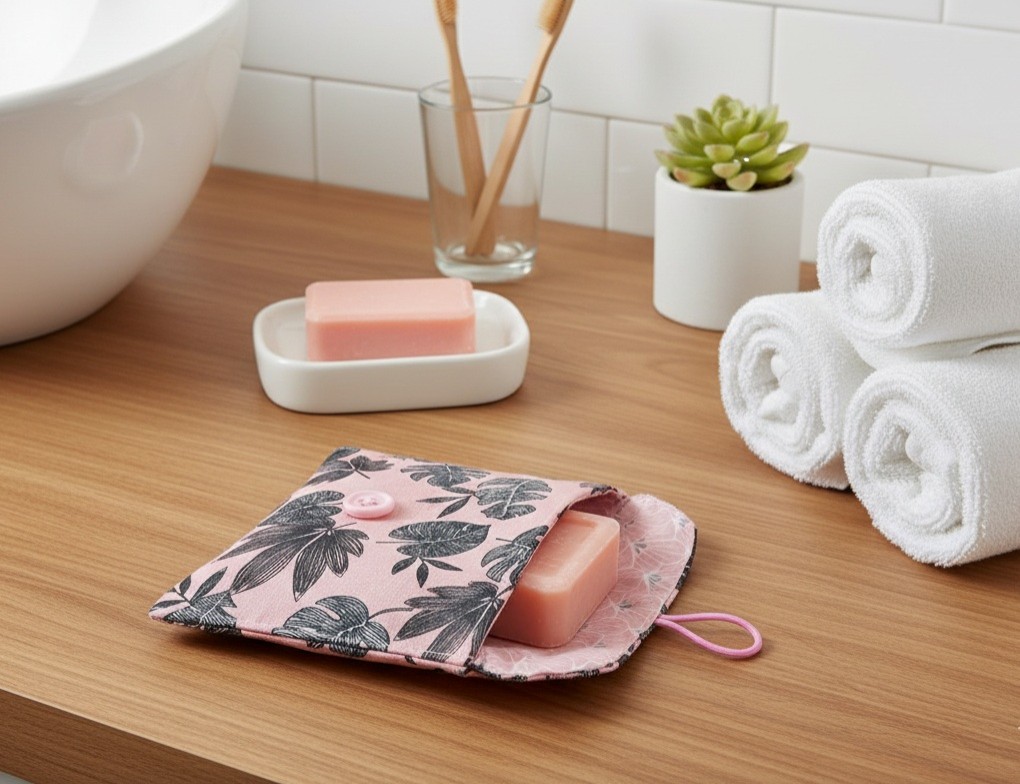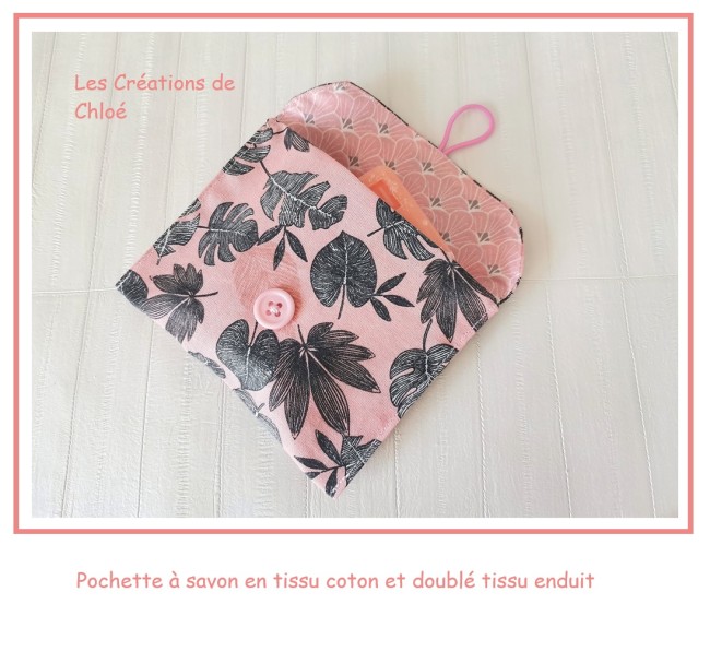 Pochette à savon tissus saumon imprimé feuilles et coton enduit rose