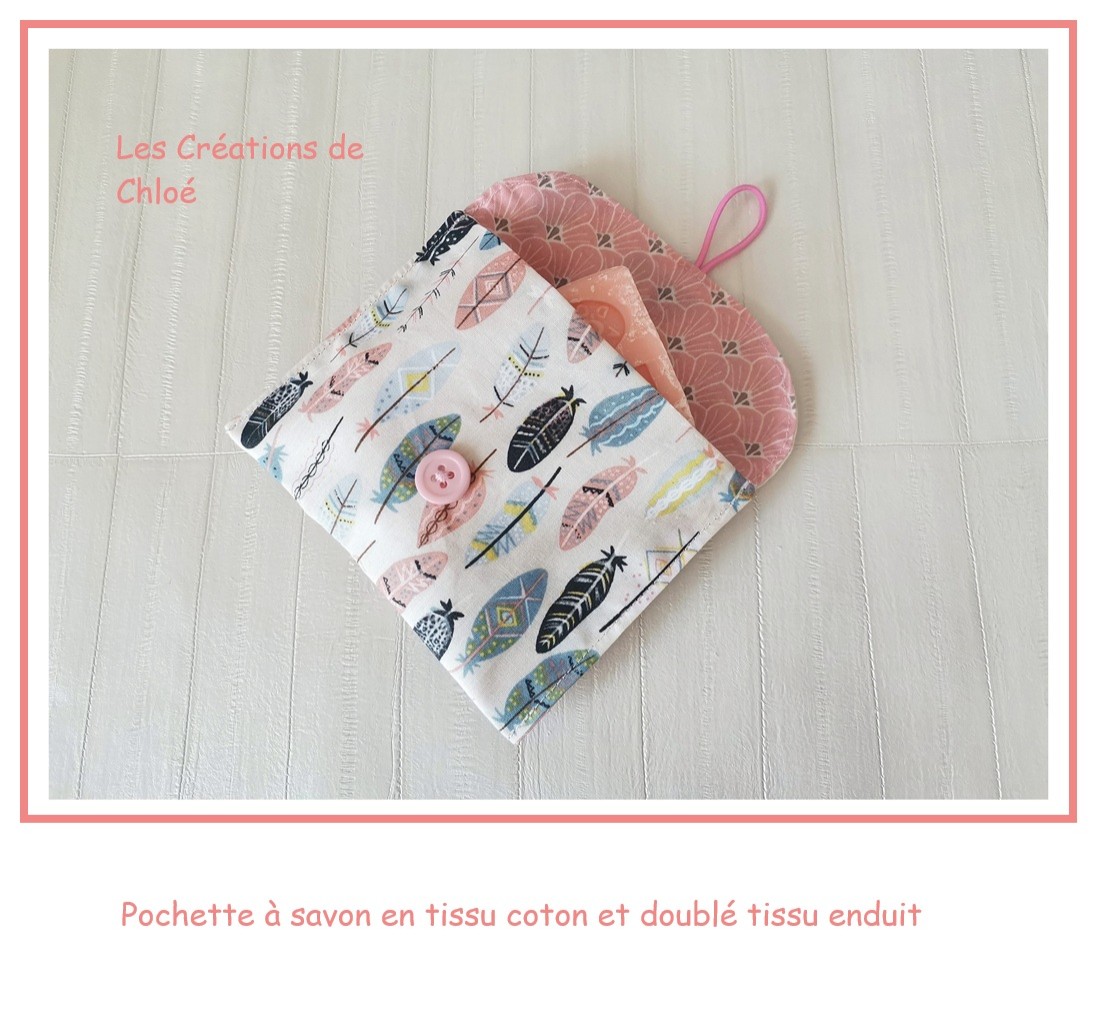 Pochette à savon tissus beige imprimé plumes et coton enduit rose