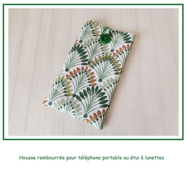 Elle est composée d'un tissu extérieur en coton imprimé certifié Oeko-Tex, un tissu intérieur en coton uni vert pale et doublée d'une fine ouate pour une meilleure protection de votre téléphone ou de vos lunettes. Fermeture par bouton avec élastique